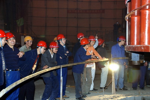 9:20時,在一聲清脆的哨響之后,170噸重的定子緩緩離開支墩,向著機(jī)坑慢慢移動。整個吊裝過程指揮有序、移動平穩(wěn)。經(jīng)過25分鐘的緊張作業(yè),2#發(fā)電機(jī)定子于9:45時順利地成功吊入機(jī)坑。