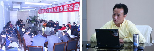 四川瀘州川南發(fā)電有限責(zé)任公司按照“整頓作風(fēng)、廉潔從業(yè)、規(guī)范管理百日專(zhuān)項(xiàng)整治活動(dòng)”和深入學(xué)習(xí)實(shí)踐科學(xué)發(fā)展觀活動(dòng)的要求,多方面抓好干部職工的學(xué)習(xí)教育工作,11月4日下午,特邀請(qǐng)四川警察學(xué)院客座教授、“中國(guó)十佳反貪局長(zhǎng)”、“中國(guó)優(yōu)秀青年衛(wèi)士”、四川省十大杰出青年、瀘州市反貪局局長(zhǎng)胥精華專(zhuān)程前來(lái)公司,對(duì)干部職工進(jìn)行廉潔從業(yè)專(zhuān)題講座。公司總經(jīng)理李勝章、黨委書(shū)記唐得旗、紀(jì)委書(shū)記、工會(huì)主席黃松以及燃煤質(zhì)檢部、物資部等各部門(mén)負(fù)責(zé)人和要害崗位職工參加了培訓(xùn)。胥局長(zhǎng)結(jié)合多年反貪工作經(jīng)驗(yàn),從腐敗的本質(zhì)、危害、腐敗產(chǎn)生的根源和預(yù)防等幾個(gè)方面,作了深入淺出的講授,對(duì)川南發(fā)電公司進(jìn)一步加強(qiáng)廉潔從業(yè)工作具有積極的啟示作用。 (姜波)