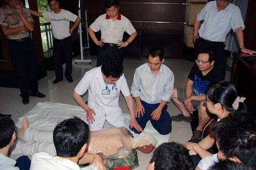 培訓(xùn)會(huì)上,謝繼林醫(yī)生結(jié)合發(fā)電企業(yè)生產(chǎn)現(xiàn)場(chǎng)發(fā)生的真實(shí)案例,采用理論講解、圖示和現(xiàn)場(chǎng)演示相結(jié)合的方式,詳細(xì)講解了 “最新國(guó)際心肺復(fù)蘇指南”、“SF6封閉組合電器漏氣及處理措施”、“觸電燒傷及其搶救措施”、“淺部軟組織創(chuàng)傷及其處理”、“熱力燒傷及其處理”、“急性損傷中毒的化學(xué)、物理因素及其搶救步驟和原則”等方面的知識(shí),并利用橡皮人進(jìn)行了模擬救護(hù)操作示范。電站現(xiàn)場(chǎng)參培訓(xùn)人員按照拍、喊、看、摸、聽等步驟,對(duì)橡皮人分別進(jìn)行了單人和雙人胸外按壓、口對(duì)口(鼻)人工呼吸救護(hù)操作。謝繼林醫(yī)生對(duì)操作不規(guī)范的員工認(rèn)真進(jìn)行了糾正,直到全部掌握操作要領(lǐng)并通過檢測(cè)。